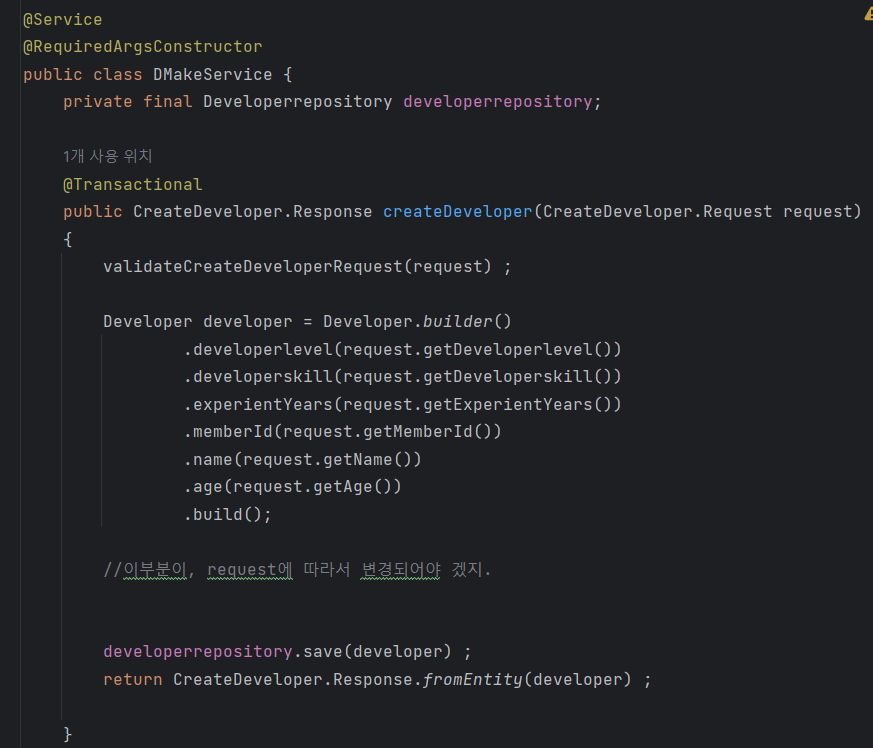 서비스 단에서 실제 DB를 저장하기 전에, REQUEST를 받아서 이를 DEVELOPER 객체에 넣기도 전에, DATA VALIDATION을 수행한다. 이때 단순한 EXCEPTION 만으로는 검증될 수 없기 때문에, 사용자 설정 EXCEPTION을 생성한다.
