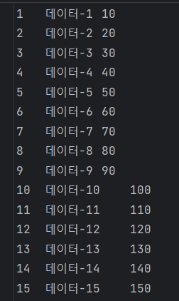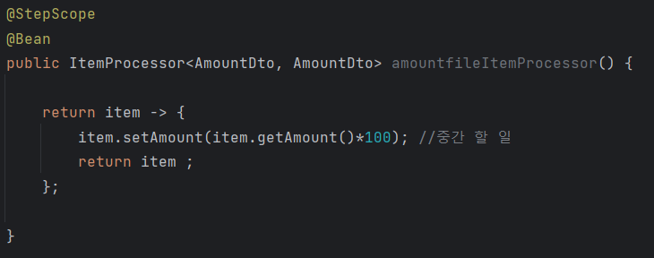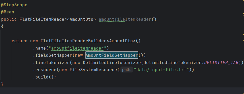 amountdto를 일겅오며, 그 이름을 지정했다. setmapper는 위에서 설정한대로, 각 라인의 분할은 linetokenizer로 분할하였다.