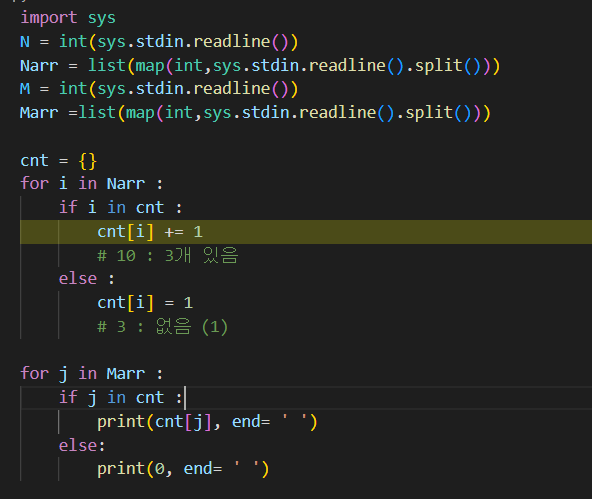 for i in Narr : if i in cnt : cnt[i] += 1 { 10 :3개있음, 15 :1(한개있음)) 이렇게 .