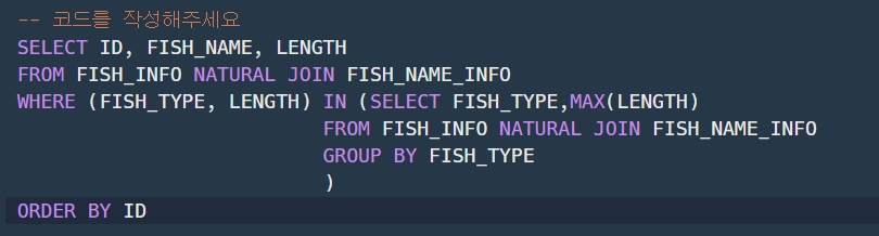 2. 서브쿼리는 WHERE절에서 = 로 비교시 1개의 COLUMN밖에 비교할 수 없다. 2개이상을 원할때는, IN을 사용하자.