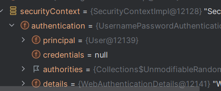 securitycontext안에 인증에 대한 pw정보는 authentication에, principal엔 user의 정보가 작성됨을 볼 수 있었다.