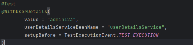 value는 그렇기 때문에 username, Beanname은 해당 userdetailsservice의 구현(현재는 loaduserbyusername을 override 하지 않았기 때문에 그대로 userdetailsservice를 사용했다. SetupBefore는 유저의 세팅 타이밍을 지정해주었다.